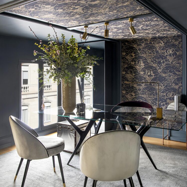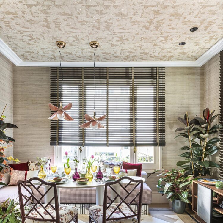 Kleur op de muren en patroon op het plafond – of juist andersom – zet je hele interieur op z’n kop (in de beste zin van het woord). Denk aan een diepe tint op de wand gecombineerd met verfijnd behang boven je hoofd.