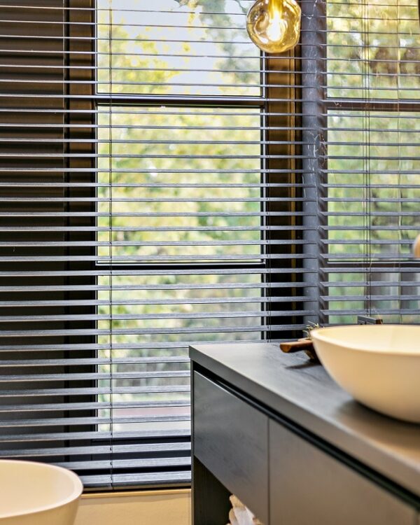 Niet alleen in de woonkamer, ook in de badkamer monteren wij deze houten jaloezieën. Super strak gecombineerd met de donkere kozijnen.