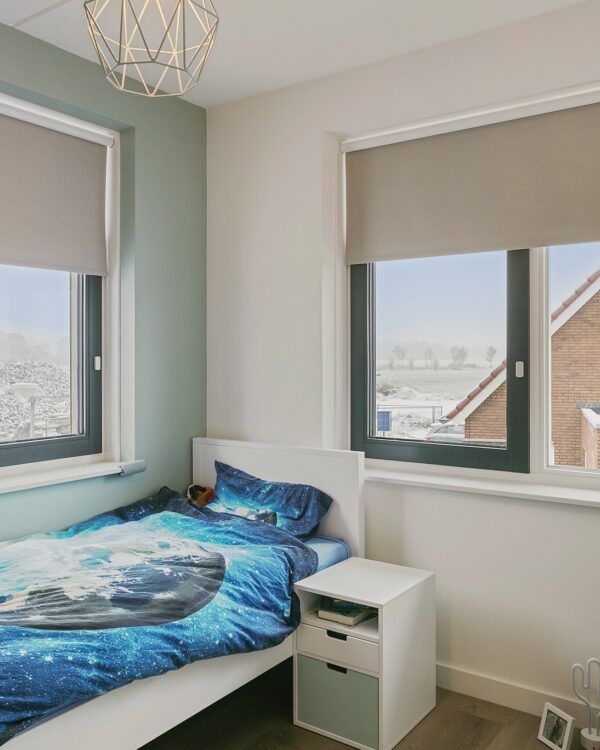Boven werd de raamdecoratie aangemeten op de kleurrijke muren. Zo kreeg de roze kamer raamdecoratie met een kekke print en de andere twee slaapkamers neutrale rolgordijnen.