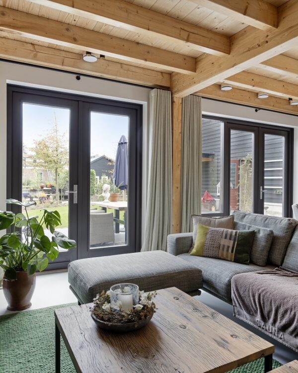In de woonkamer en keuken blijven we in de natuurlijke sferen. En welke raamdecoratie sluit daar goed bij aan? Juist, houten jaloezieën! We hebben gekozen voor de zwarte variant om een moderne sfeer te creëren die naadloos aansluit op de stalen deur en de donkere keuken. Het voordeel van houten jaloezieën is niet alleen dat ze praktisch zijn om je eigen lichtinval en privacy te regelen, maar ze zijn ook nog eens een lust voor het oog. Omdat we bij Thuisin alles op maat maken, konden we elk raam in de woonkamer en keuken voorzien van zwarte houten jaloezieën